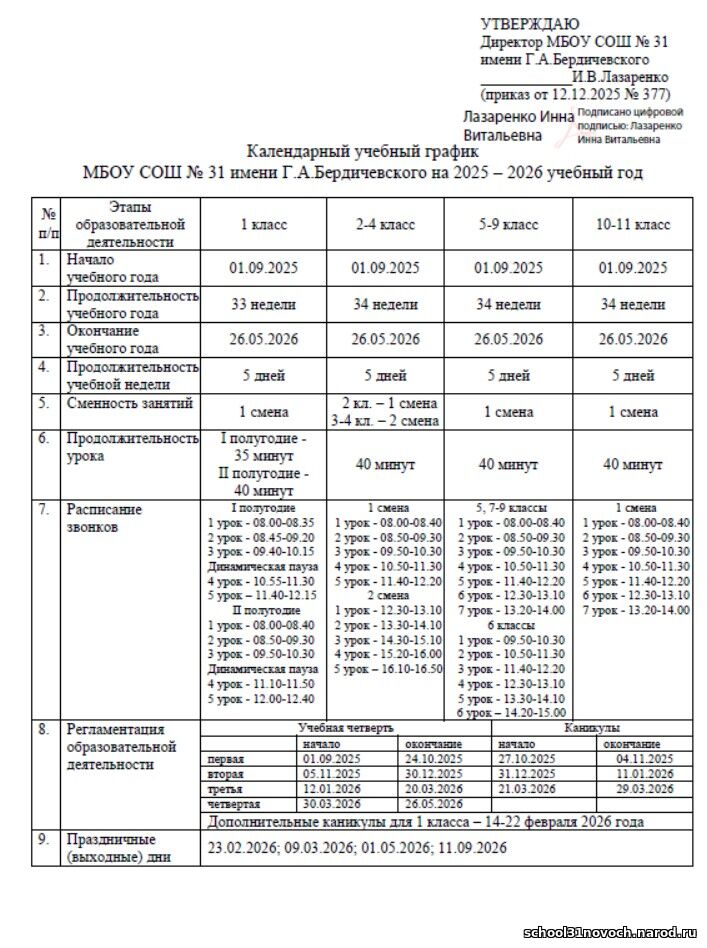 Календарный учебный график МБОУ СОШ № 31 имени Г.А. Бердичевского
