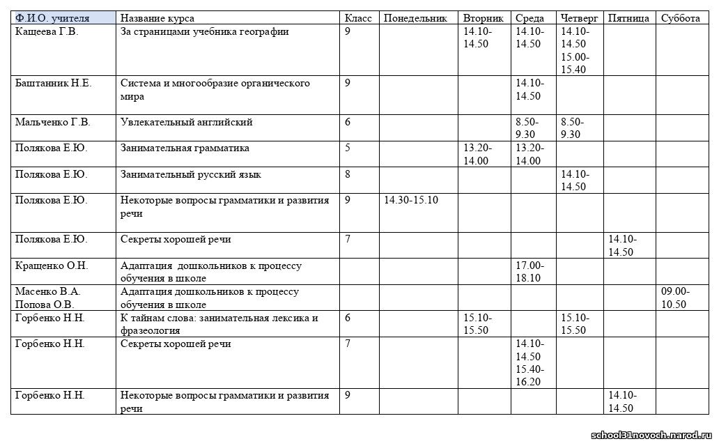 Расписание занятий платных дополнительных образовательных услуг