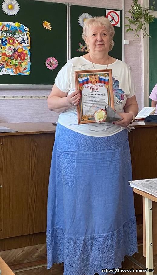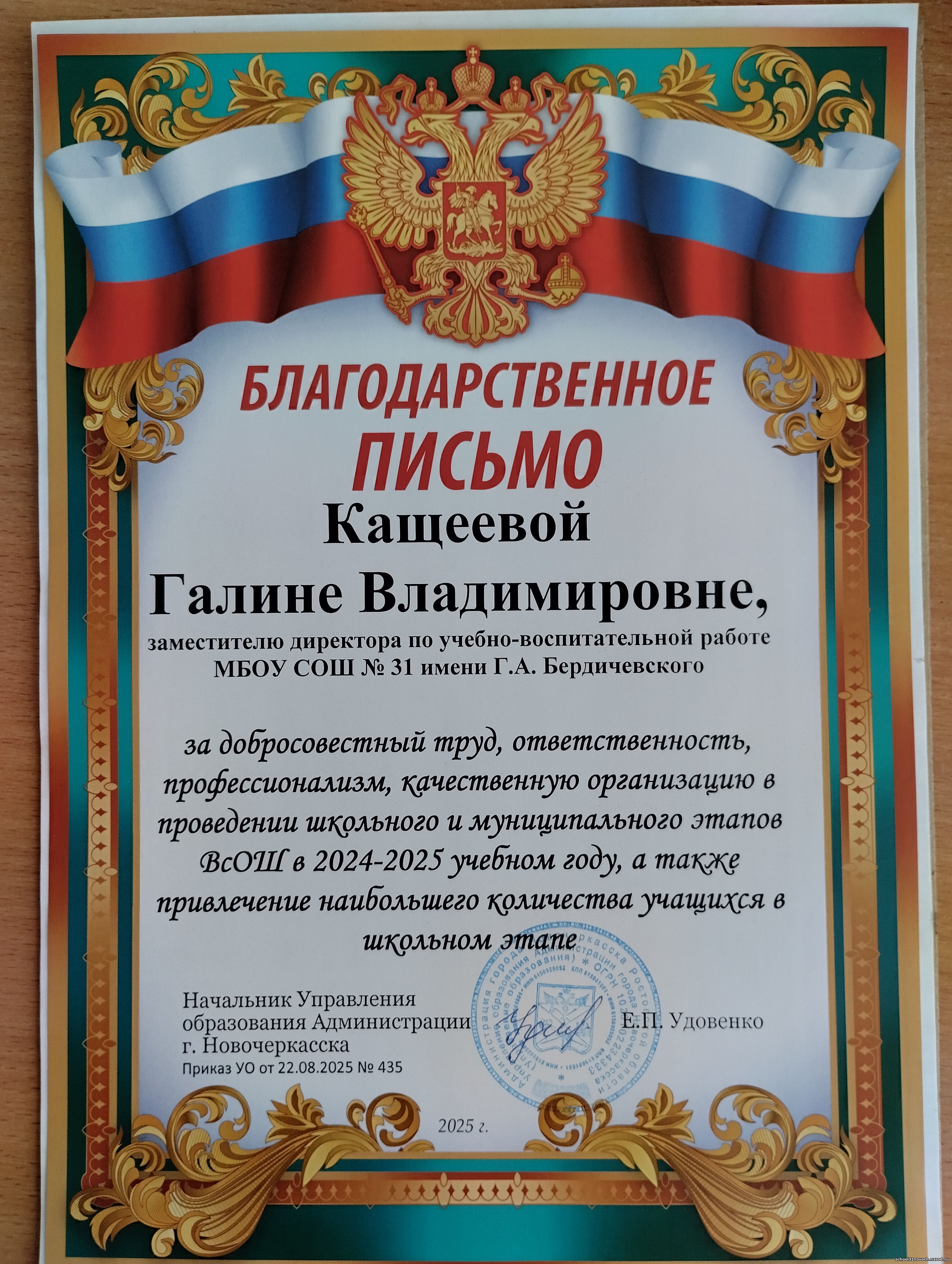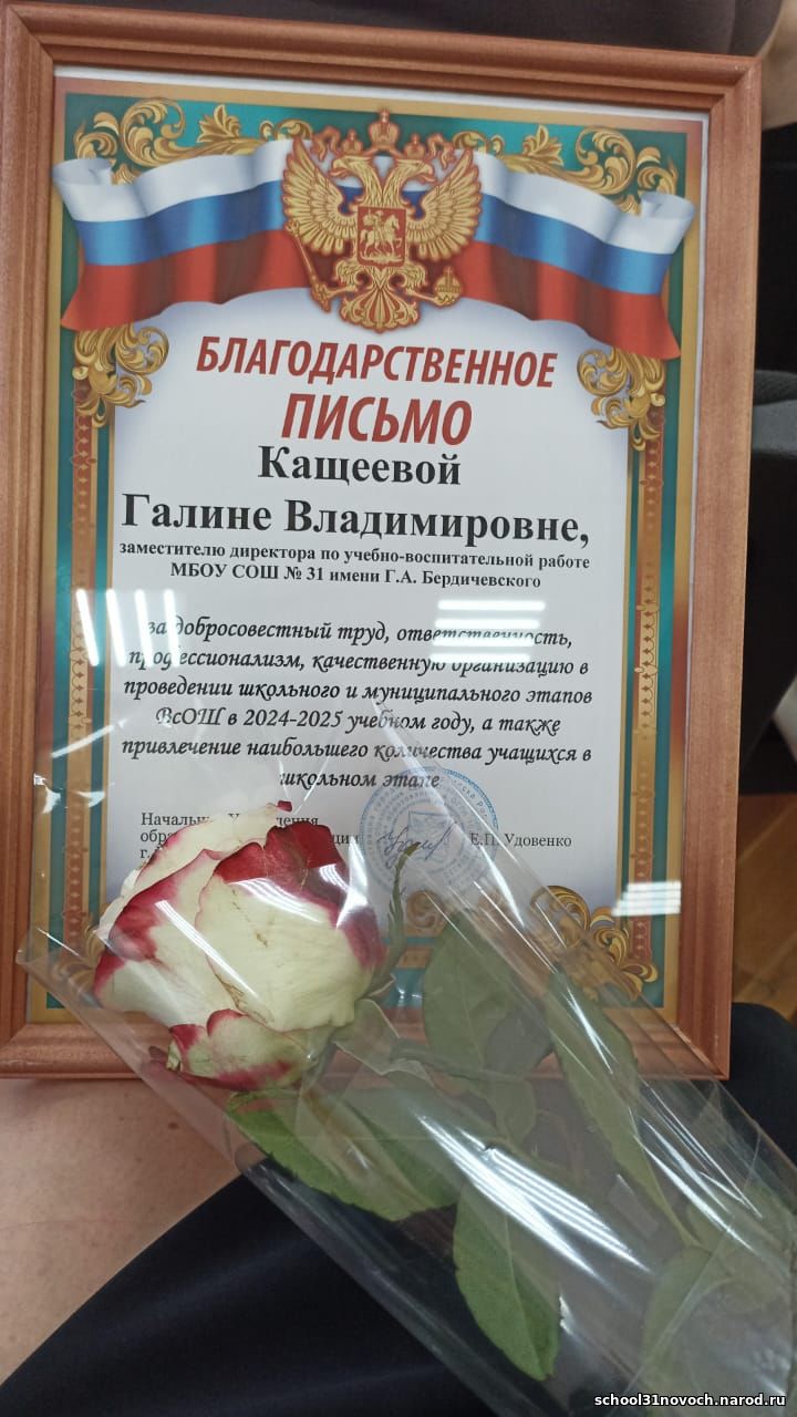 Благодарственным письмом Управления образования Администрации г. Новочеркасска награждена Кащеева Галина Владимировна за добросовестный труд, ответственность, профессионализм, качественную организацию в проведении школьного и муниципального этапов ВсОШ в 2024-2025 учебном году, а также привлечение наибольшего количества учащихся в школьном этапе.